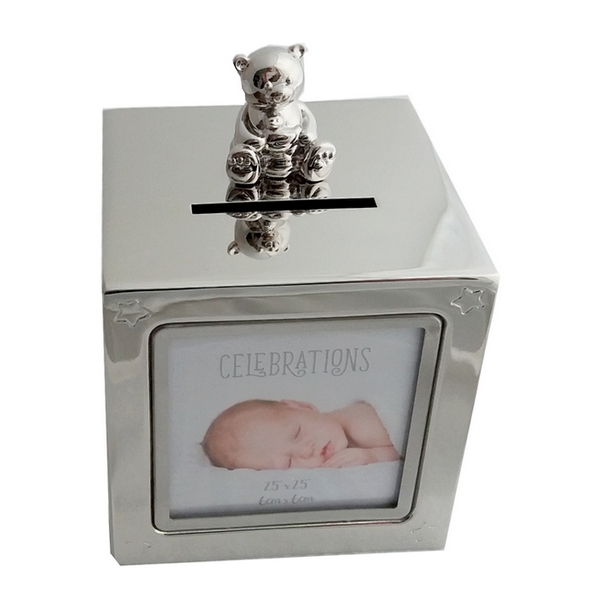 Bamse – Sparebøsse i sølvplet med gravering gratis! Fotoramme – foto 6 X 6 cm.