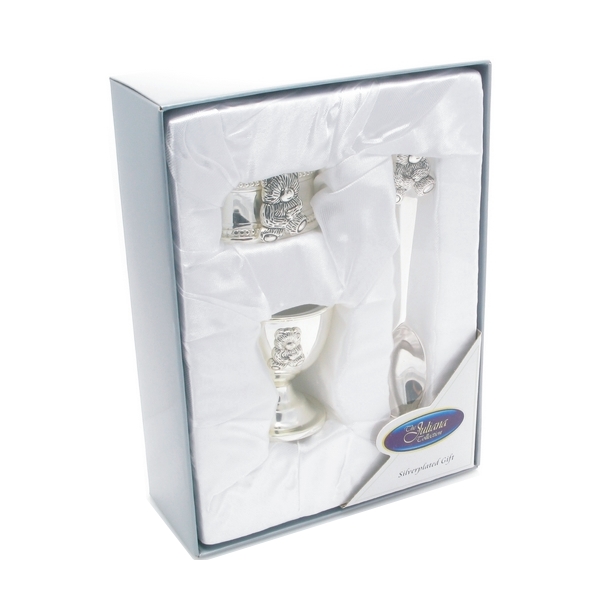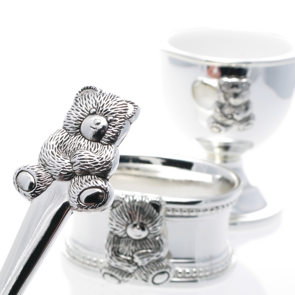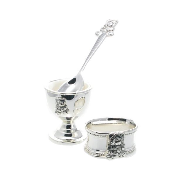 Morgenmadssæt ægstand, servietring & teesker – sølvbelagt. Gratis gravering!