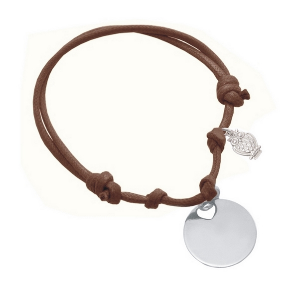 Armbåndet er udført med farvet tråd og sølvelement. Armbånd i bomuld med vedhæng i sølv med blank overflade. Armbånd med navn Armbånd til børn med gravering gratis.